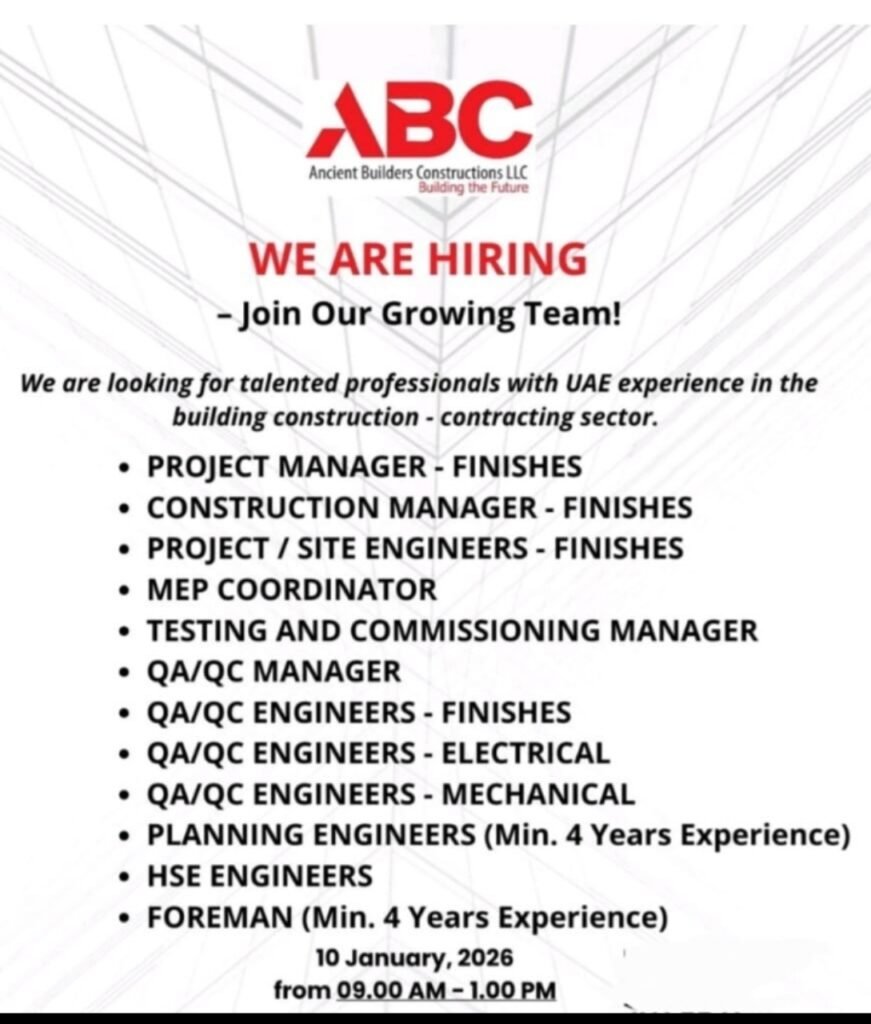 Trending Keywords for SEO: UAE construction jobs, walk in interview Dubai 2026, project manager vacancies UAE, MEP coordinator jobs, QA QC engineer careers, construction jobs in UAE, Ancient Builders Constructors, finishing jobs construction, HSE engineer vacancy, planning engineer UAE, foreman jobs, building construction contracting sector, UAE experience jobs, hiring in Dubai.