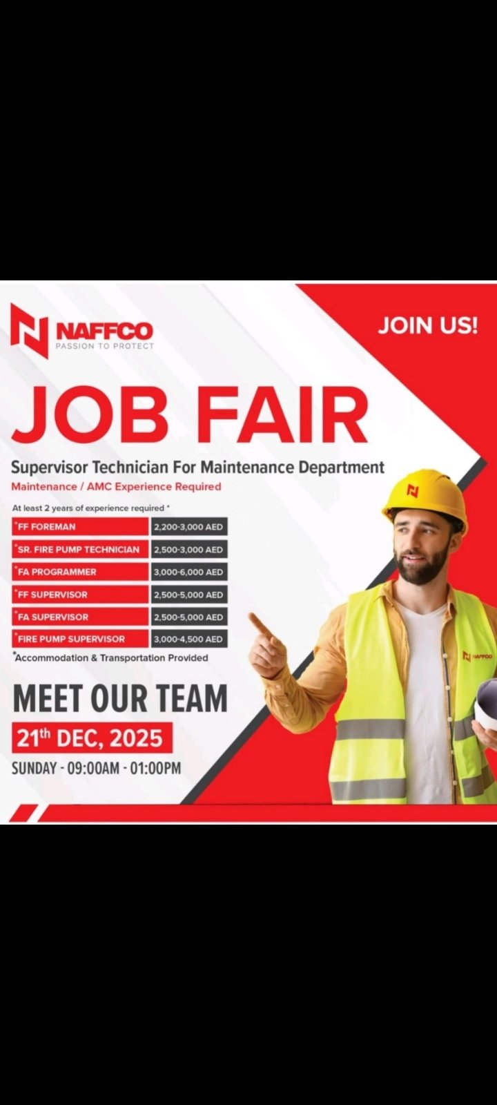 · The post uses hashtags: #NAFFCO #JobFair #DubaiJobs #MaintenanceHiring #CareerOpportunity.