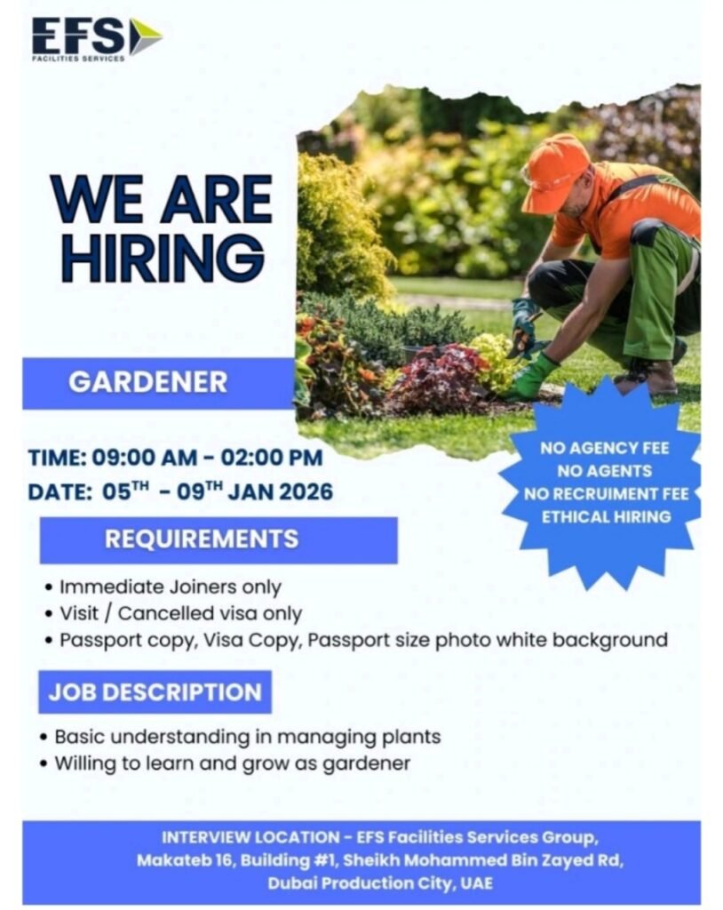 gardener jobs in Dubai, immediate joiners Dubai, visit visa jobs Dubai, cancelled visa jobs, EFS Facilities Services careers, gardening jobs UAE, short-term jobs Dubai, plant care jobs, Dubai Production City jobs, facility services jobs