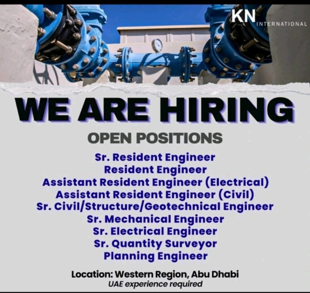 Keywords: engineering jobs in Abu Dhabi, KN International careers, UAE engineering vacancies, resident engineer jobs UAE, senior civil engineer jobs Abu Dhabi, mechanical electrical engineer jobs, quantity surveyor jobs UAE, planning engineer careers, Western Region Abu Dhabi jobs, UAE experience required engineering.