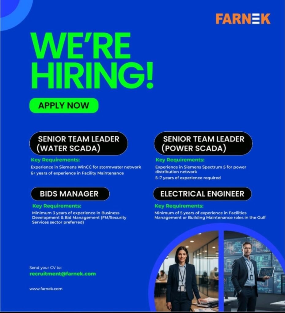 Are you a skilled professional looking to advance your career in facility management, SCADA systems, or engineering? Farnek, a leading name in innovative facility management and sustainable services, is currently hiring for multiple key positions. This is your chance to join a dynamic team in a growing sector, offering roles that challenge your expertise and reward your experience.
