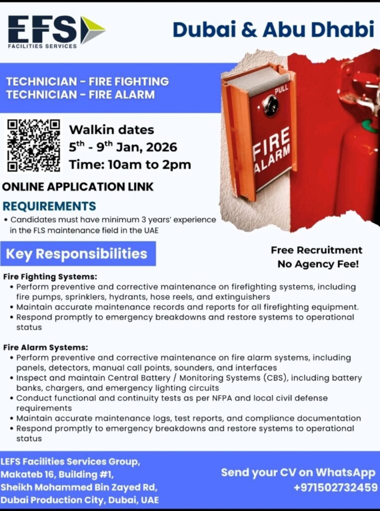 · Minimum 3 years of experience in Fire & Life Safety (FLS) maintenance in the UAE.