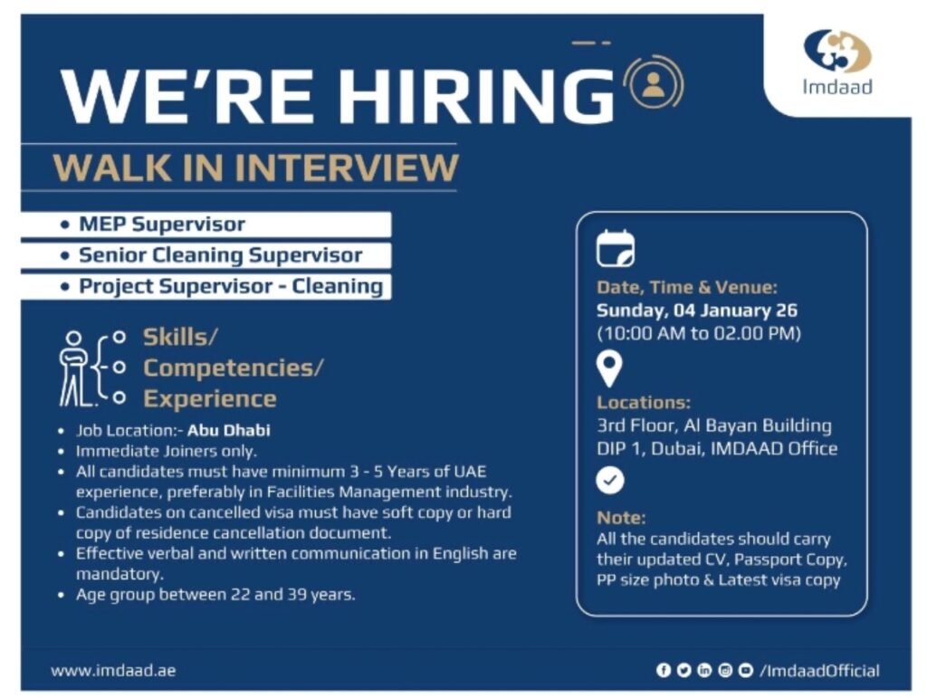 Imdaad is looking for experienced professionals to fill key supervisory roles. The walk-in interviews are scheduled for Sunday, 4th January 2026, from 10:00 AM to 2:00 PM. Hereโs a quick overview of the available positions: