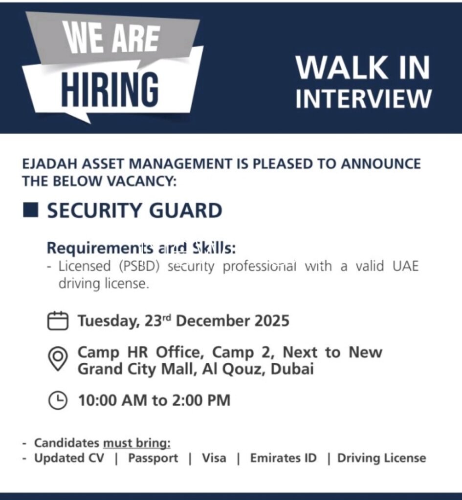Are you a licensed security professional looking for a rewarding career in Dubai? Ejadah Asset Management Group is expanding its team and is conducting a walk-in interview for the position of Security Guard. If you hold a valid PSBD license and a UAE driving license, this could be your opportunity to join a respected organization committed to safety, professionalism, and excellence.