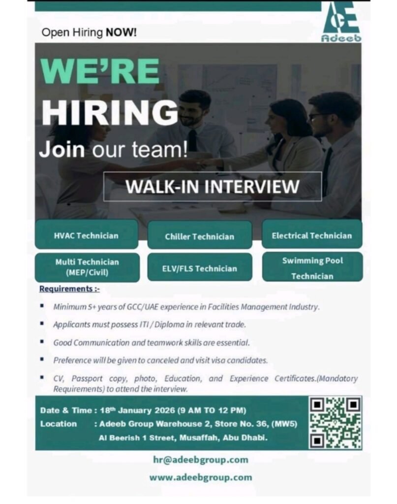 Are you an experienced technician looking for your next career move in the UAE? A fantastic opportunity has just arrived. Adeeb Group has announced a walk-in interview event, and they are actively seeking skilled professionals to join their dynamic team. If you have a solid background in facilities management and are ready to take on a new challenge, mark your calendar for January 18th, 2026.
