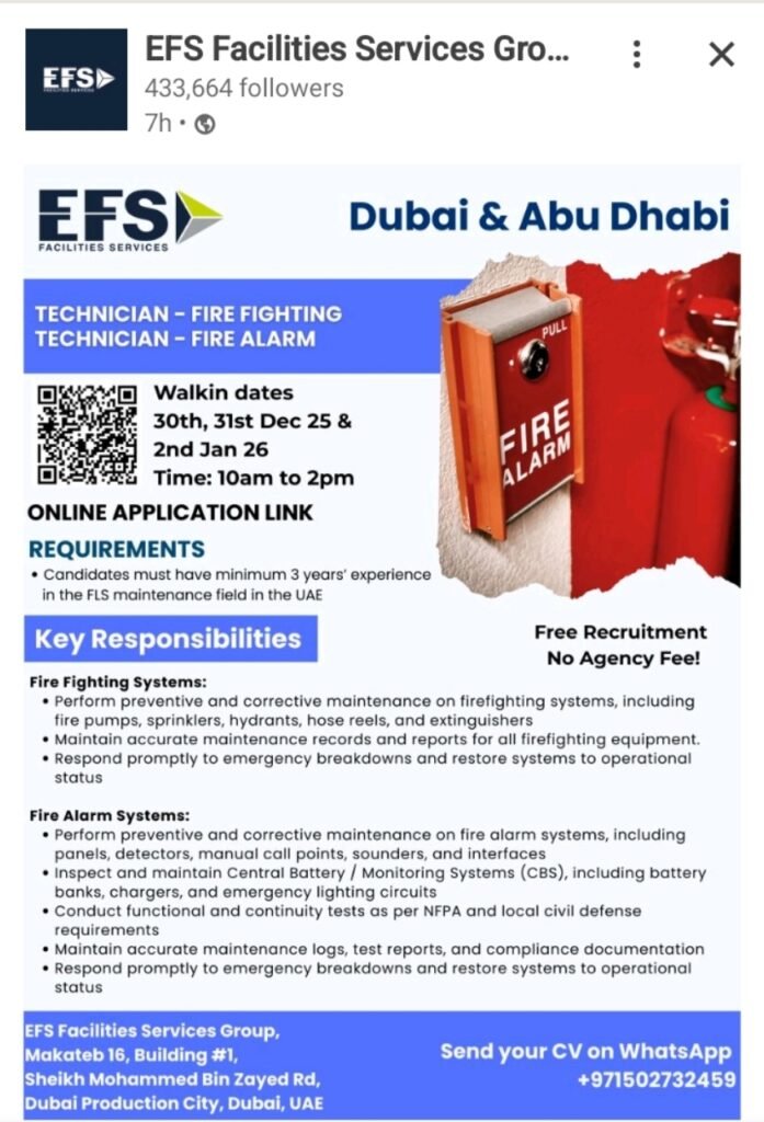 Fire Technician jobs Dubai,Fire Alarm Technician vacancy Abu Dhabi, Walk in interview Dubai December 2025, EFS Facilities Services careers, Fire Fighting jobs UAE, Facility management jobs, Fire and Safety technician, UAE Civil Defense approved jobs, Maintenance technician jobs, Immediate hiring Dubai.
