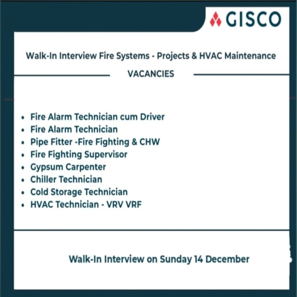 The notice uses relevant industry hashtags like#hvac, #firealarmtechnician, #hiring, #technician, #pipefitter, #firefighting, etc.