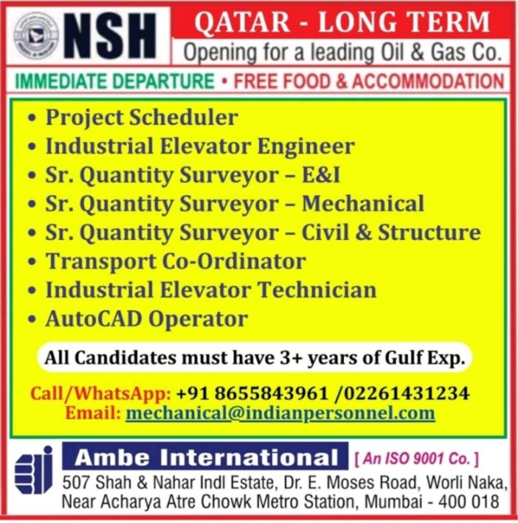 Trending Keywords for SEO: Qatar oil and gas jobs, immediate departure jobs Qatar, free accommodation jobs Gulf, Gulf experience jobs, project scheduler Qatar, senior quantity surveyor jobs, industrial elevator engineer, AutoCAD operator Gulf jobs, long term jobs in Qatar, Ambe International recruitment.