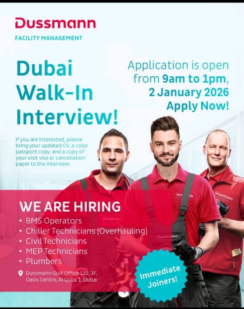 Keywords for SEO: Dubai jobs 2026, walk in interview Dubai, facility management jobs, immediate hiring Dubai, BMS operator jobs, chiller technician vacancies, MEP jobs Dubai, Dussmann career, jobs in Al Qouz, visa cancellation candidates, technical jobs UAE, immediate joiners, January 2026 interview.