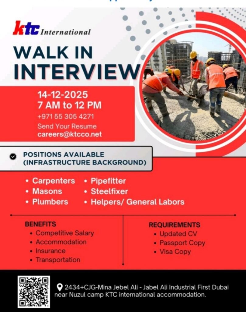 Looking for an exciting career opportunity in Dubai’s thriving infrastructure sector? KTC International is hosting a walk-in interview this Sunday, offering skilled workers the chance to join a dynamic and growing team. Whether you’re a carpenter, plumber, steelfixer, or general laborer, this could be your moment to secure a rewarding role with a respected international company.