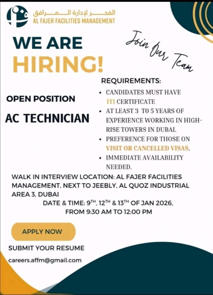 AC Technician Al Fajer Facilities Management, Next to Jeebly, Al Quoz Industrial Area 3, Dubai 9th, 12th & 13th of January 2026 9:30 AM to 12:00 PM